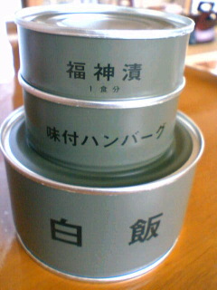 上から福神漬け、ハンバーグ、ご飯ですが、小さい缶詰のおかず類は、他にたしか何かの魚の蒲焼と野菜炒めでした。